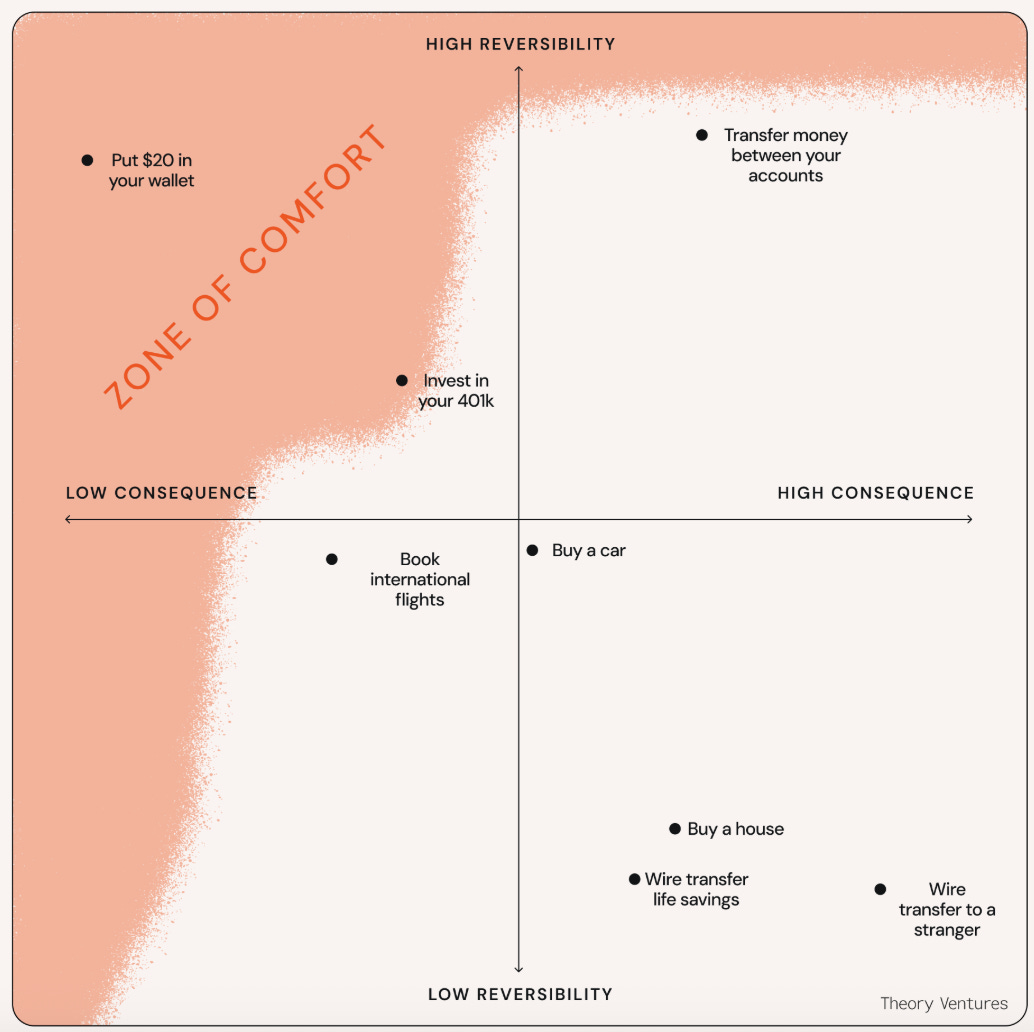 This post from Theory VC looks at why AI agents still struggle with real-world tasks like buying a car or booking international flights. The issue isn’t tools or intelligence. It’s trust. Most decisions fall outside a user’s “zone of comfort,” where the perceived consequences are too high or reversibility is too low. Booking travel, especially across systems and currencies, is still seen as a one-way door decision. There’s no good way to undo a bad booking, so users (and agents) hesitate. In contrast, software development works well for agents because it’s full of systems that make decisions easy to reverse and consequences easier to manage. Until those support systems for travel and other domains exist, agents will be limited to safer, more controlled environments.
