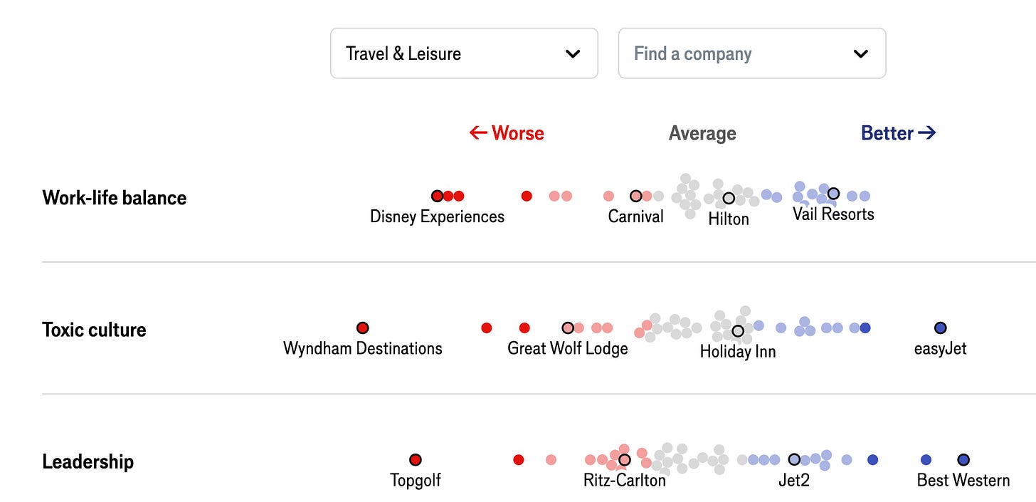 The Economist partnered with CultureX, a firm co-founded by MIT Sloan’s Donald Sull, to analyze employee reviews from 900 companies across 19 industries, including Travel & Leisure. Using language models to assess how employees describe their experience (not just ratings), they scored companies on topics like leadership, work-life balance, transparency and agility. The interactive tool lets you explore how companies compare and how their cultures have shifted post-COVID. Read +
